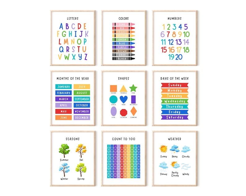Set of 9 Educational Wall Art, Classroom Posters, Homeschool Printables, Educational Poster, Alphabet Poster, Playroom Poster, Montessori, Playroom Sign, Classroom Bundle, Kindergarten Classroom Prints