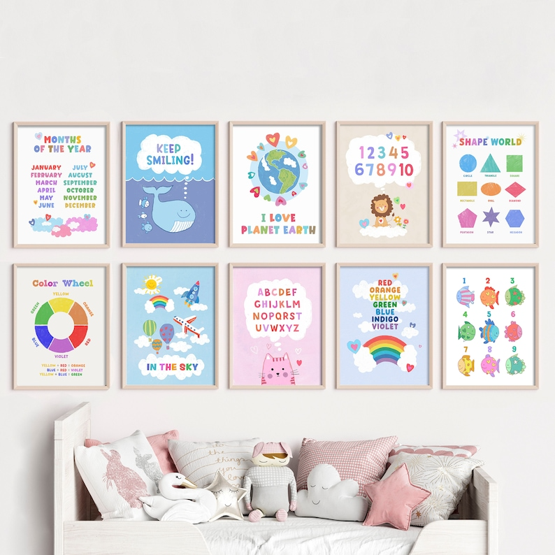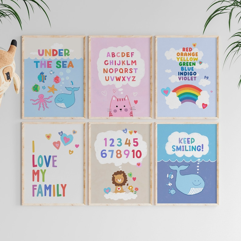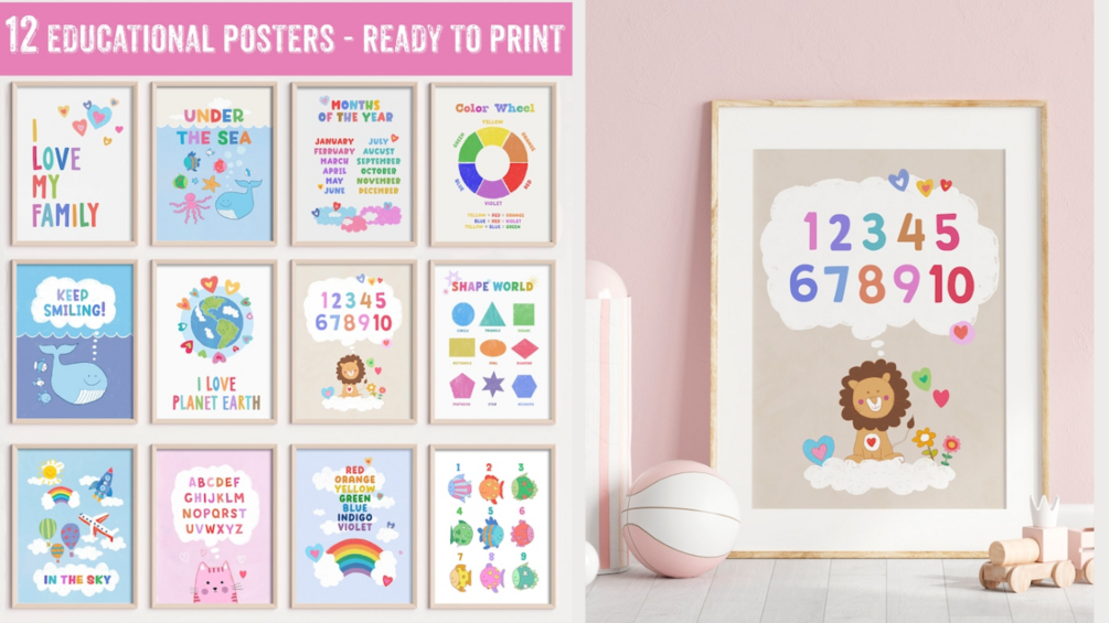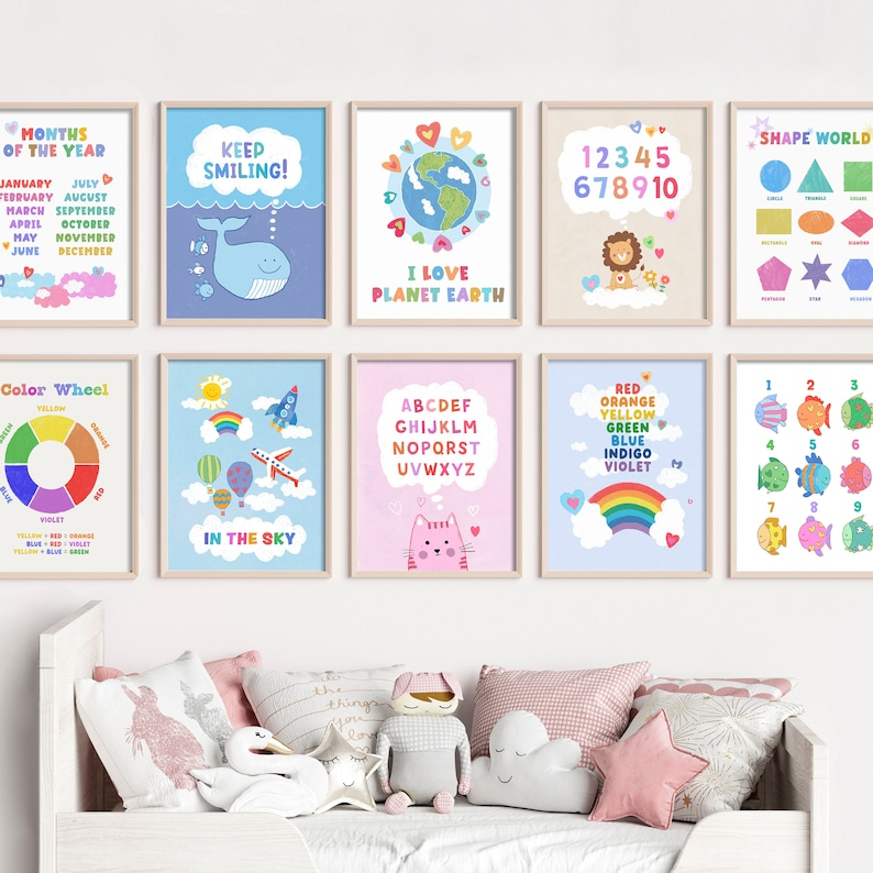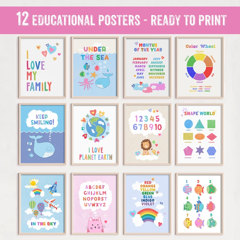 Adorable set of 12 educational posters perfect for kids to learn, become more confident, and have fun while learning. Ideal for nurseries, homeschooling environments, playrooms, room walls, and classrooms. The set includes printables for the alphabet, colors, numbers, and much more!